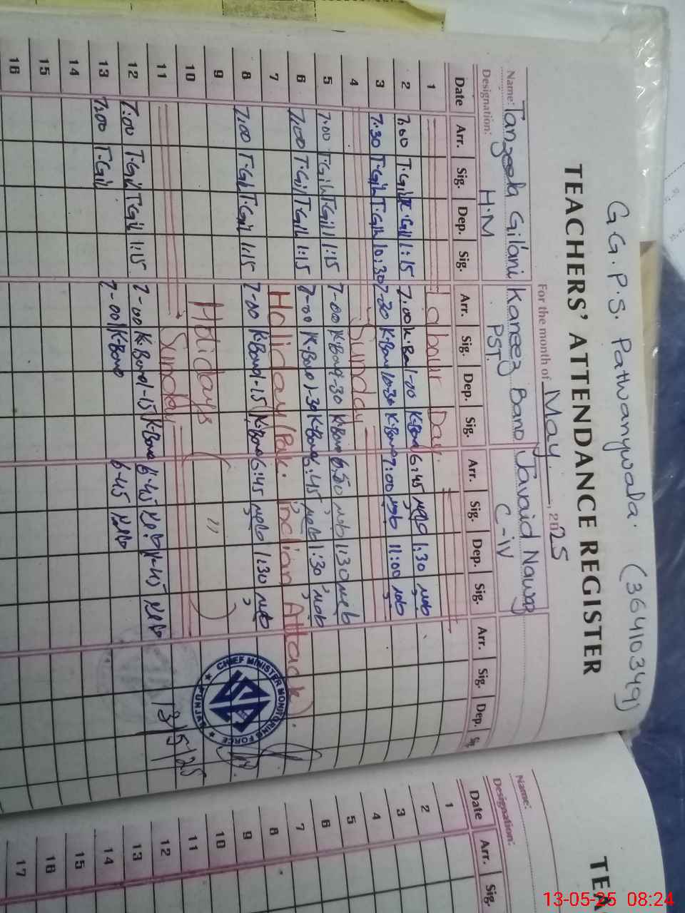 | CNIC | Full Name | Designation | R/C | Absence During Last Calender Month |