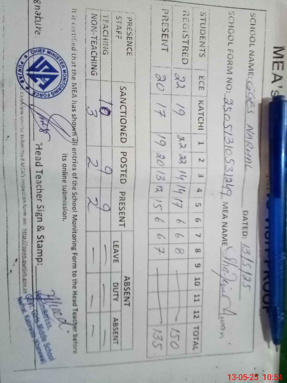 | Attendance Register | Head Teacher | MEA with School | Visit Proof |