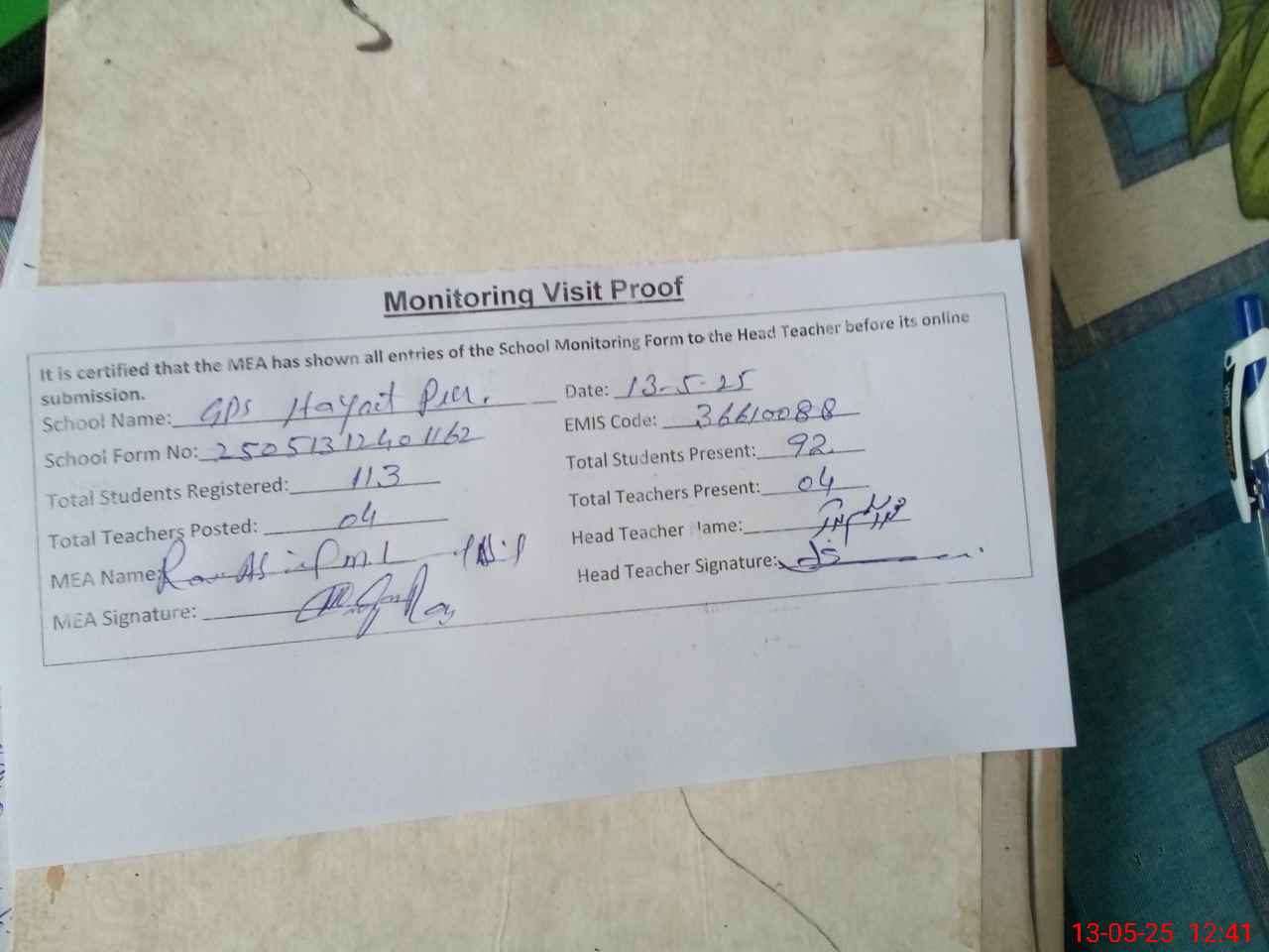 | EMIS Code: 36610088 | Name of School: GPS HAYAT PUR | |||