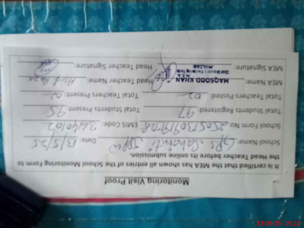 | Certified that this School was Inspected by the Undersigned MEA/DMO Today and the Information Stated Above is as Per Record. | |||||