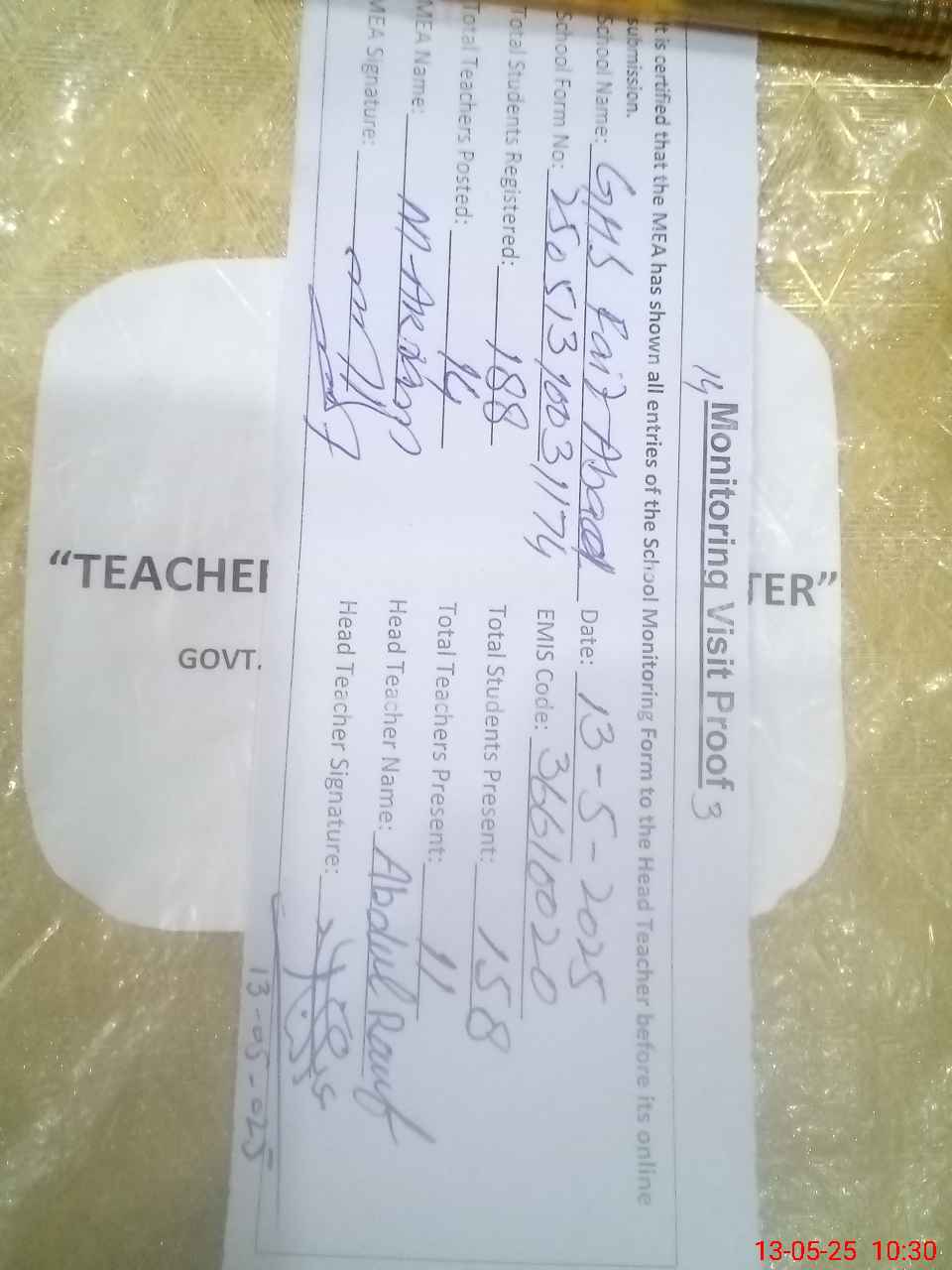 | Attendance Register | Head Teacher | MEA with School | Visit Proof |
