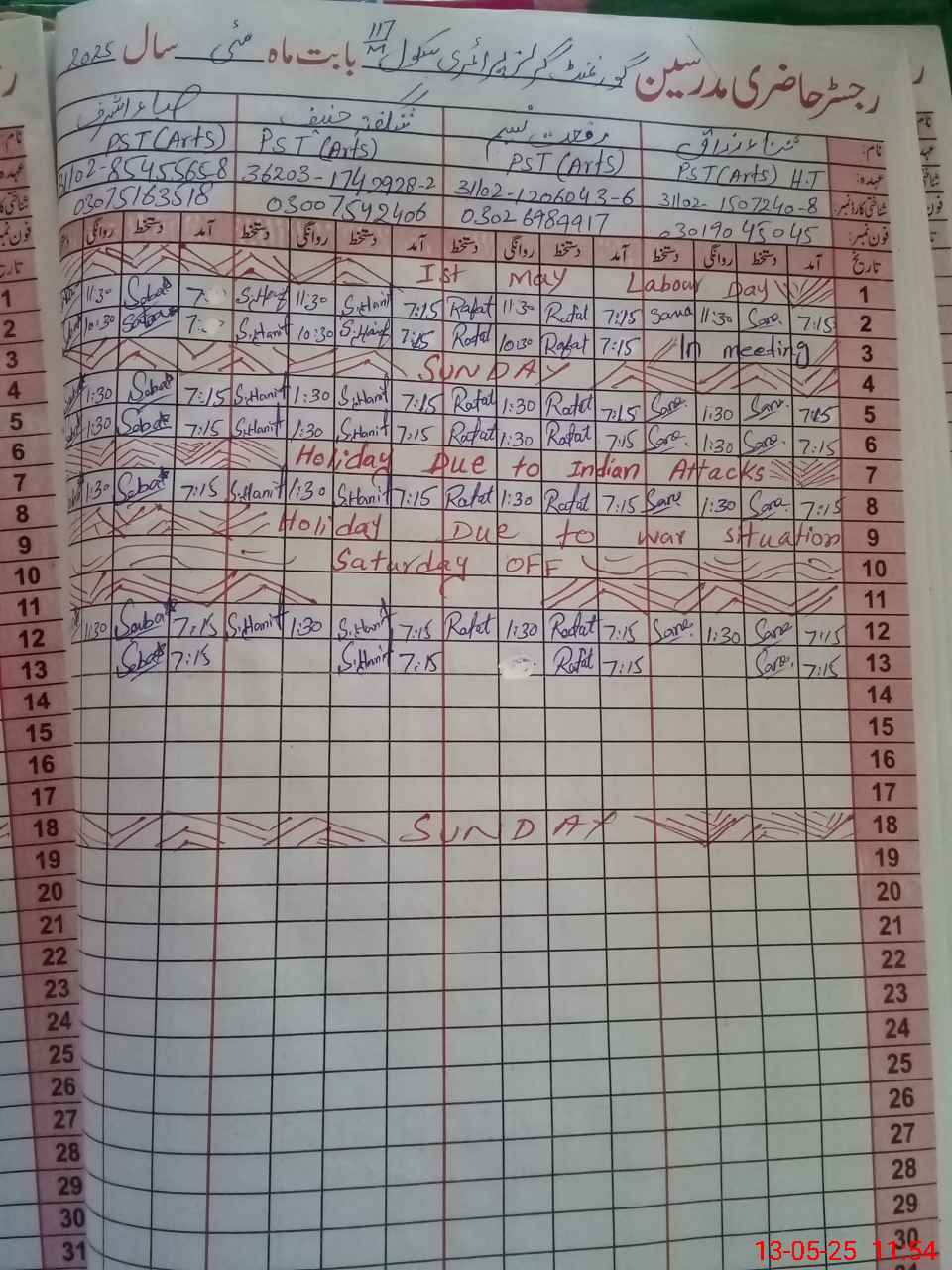 | CNIC | Full Name | Designation | R/C | Absence During Last Calender Month |