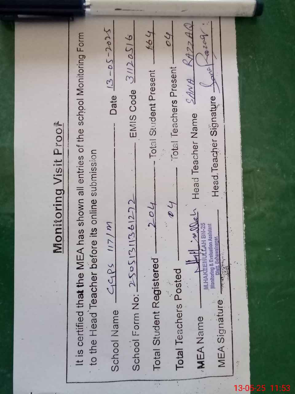| Attendance Register | Head Teacher | MEA with School | Visit Proof |