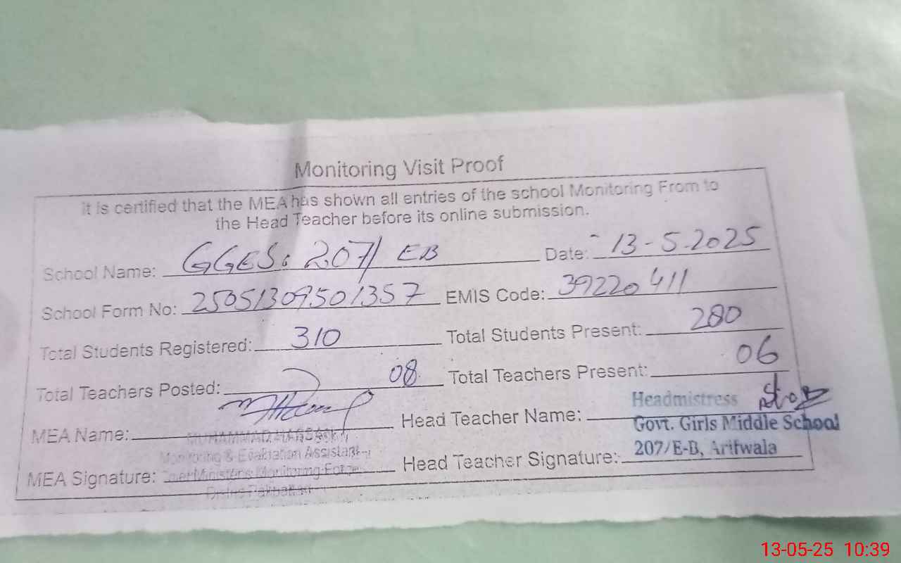 | Certified that this School was Inspected by the Undersigned MEA/DMO Today and the Information Stated Above is as Per Record. | |||||
