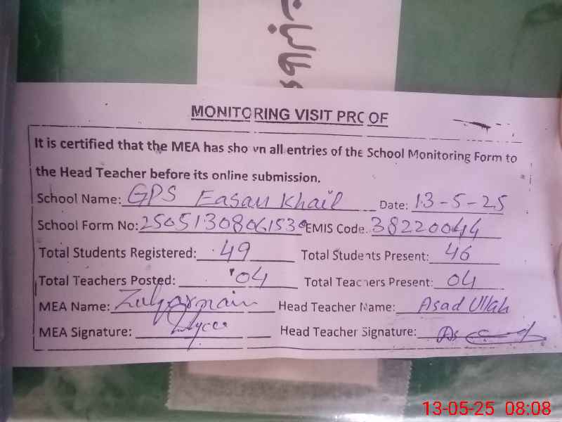| EMIS Code: 38220044 | Name of School: GPS EASAN KHAIL | |||