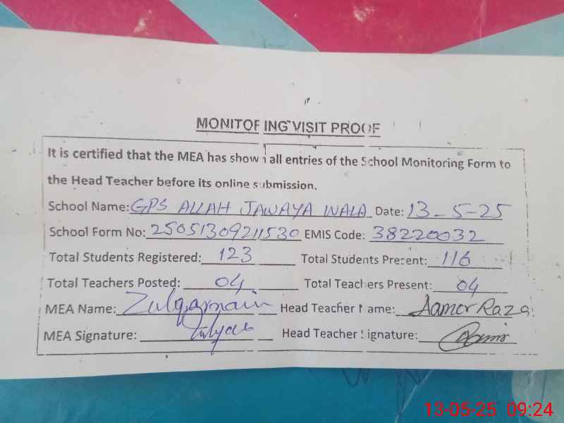 | EMIS Code: 38220032 | Name of School: GPS ALLAH JAWAYA WALA | |||