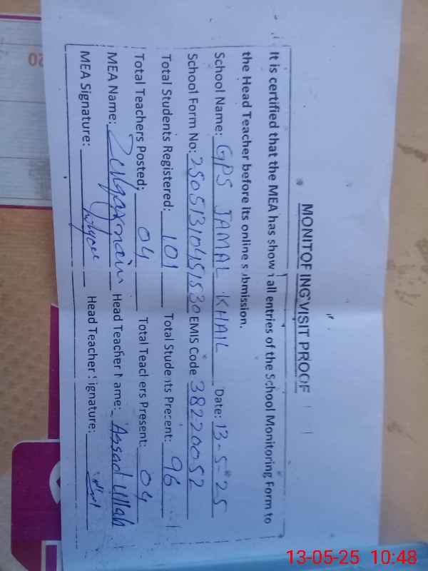 | EMIS Code: 38220052 | Name of School: GPS JAMAL KHAIL | |||