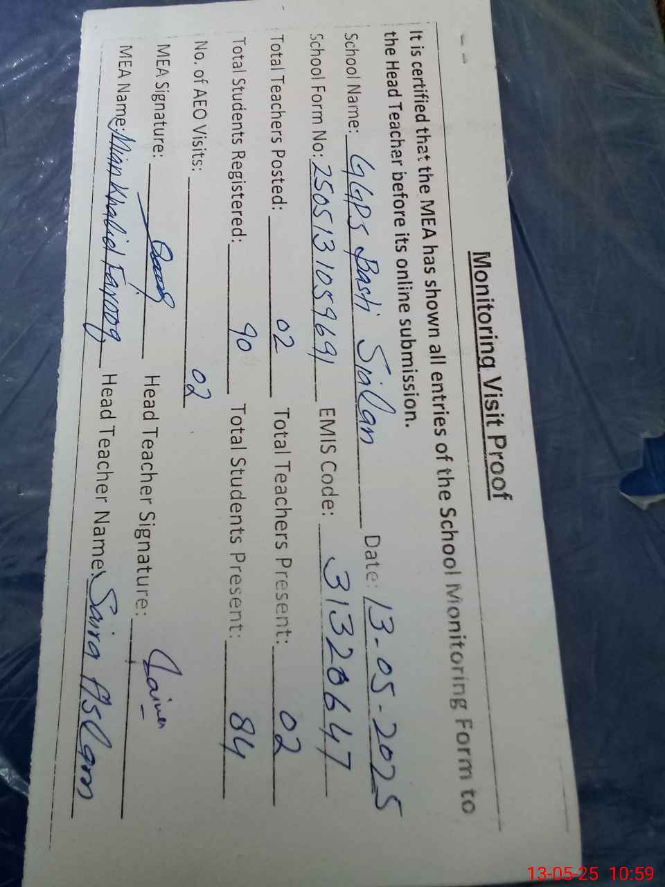 | Certified that this School was Inspected by the Undersigned MEA/DMO Today and the Information Stated Above is as Per Record. | |||||