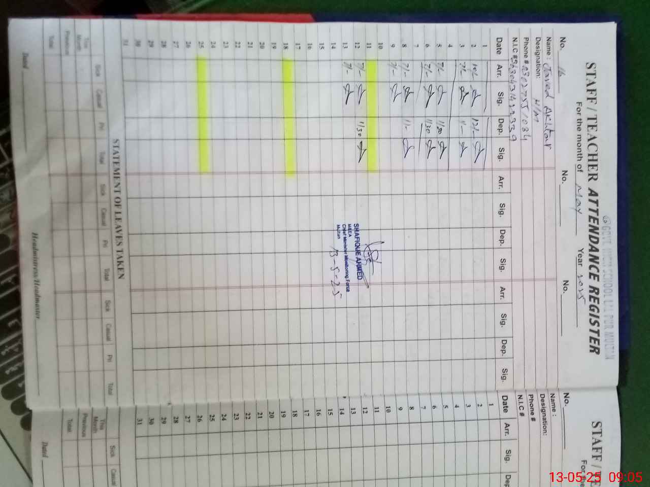 | Name: Sh**** Mu**** Designation: (School Headmaster's/Headmistress's) Incharg Phone/Cell Number: 03**** |