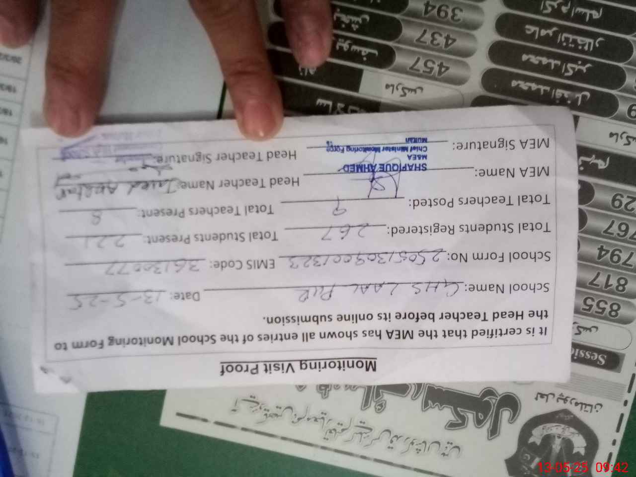 | Attendance Register | Head Teacher | MEA with School | Visit Proof |