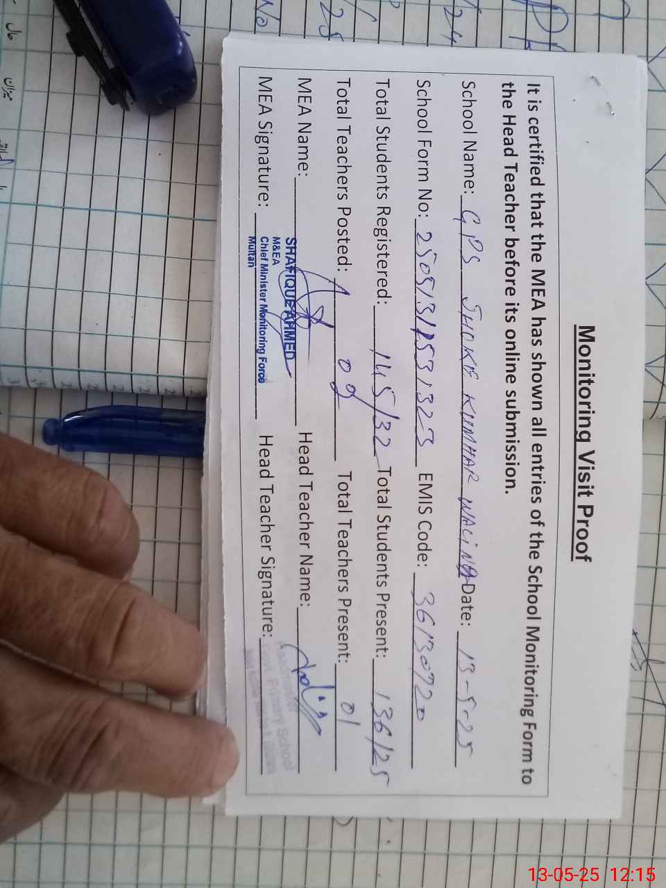 | Attendance Register | Head Teacher | MEA with School | Visit Proof |