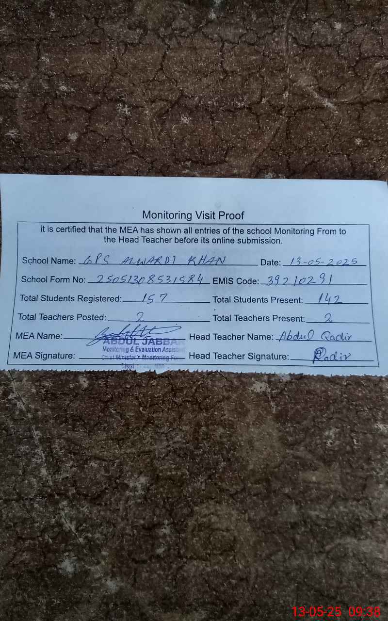 | EMIS Code: 39210291 | Name of School: GPS ALWARDI KHAN | |||