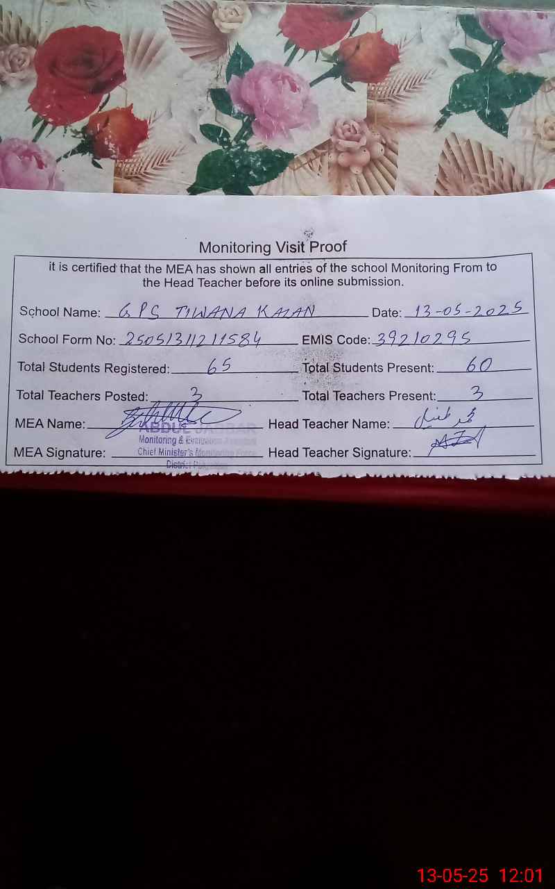 | EMIS Code: 39210295 | Name of School: GPS TIWANA KALAN | |||