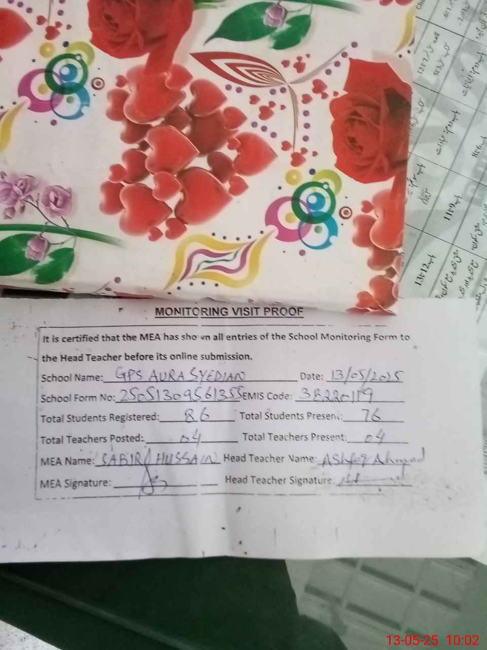 | Certified that this School was Inspected by the Undersigned MEA/DMO Today and the Information Stated Above is as Per Record. | |||||