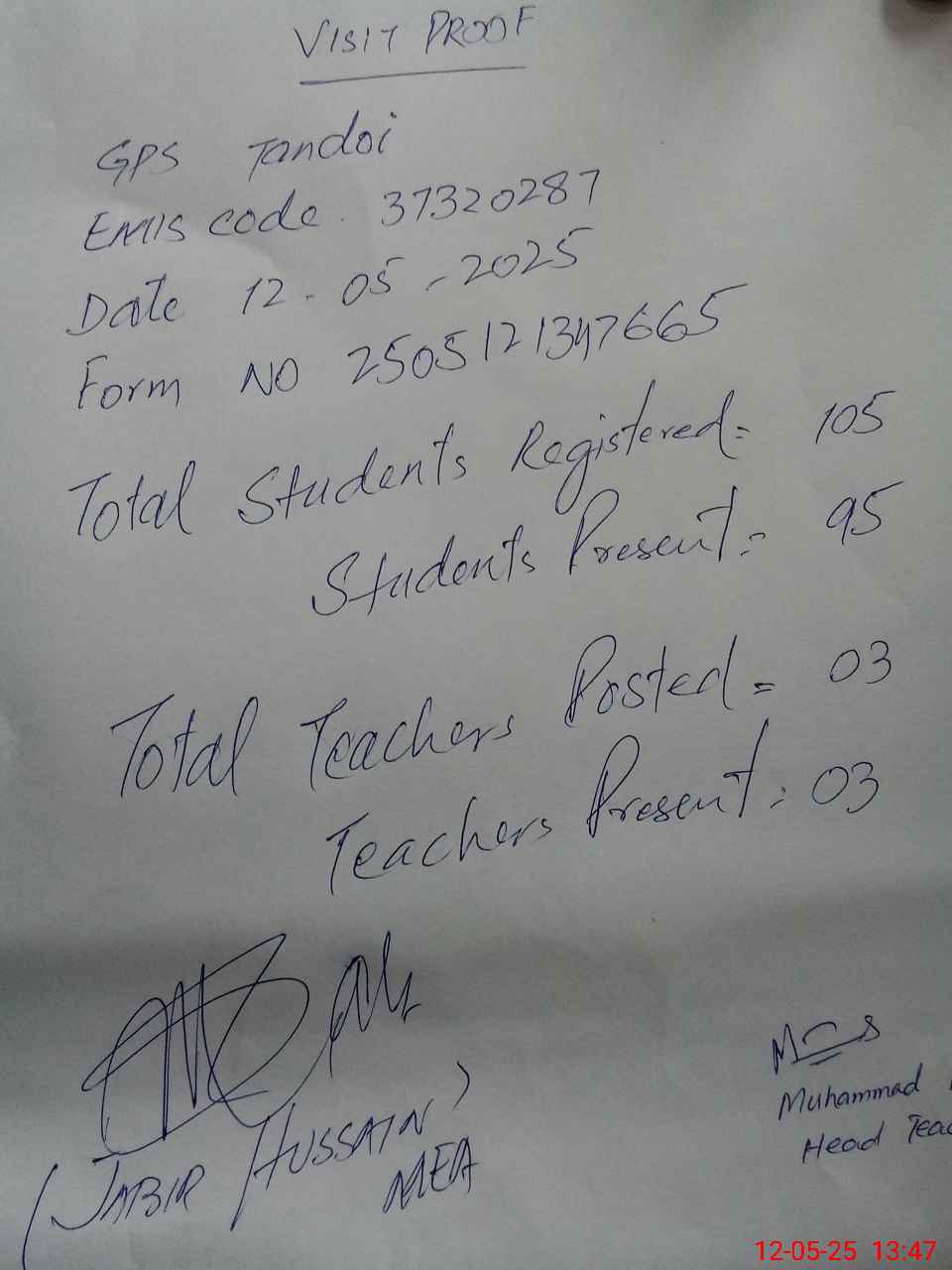 | Attendance Register | Head Teacher | MEA with School | Visit Proof |