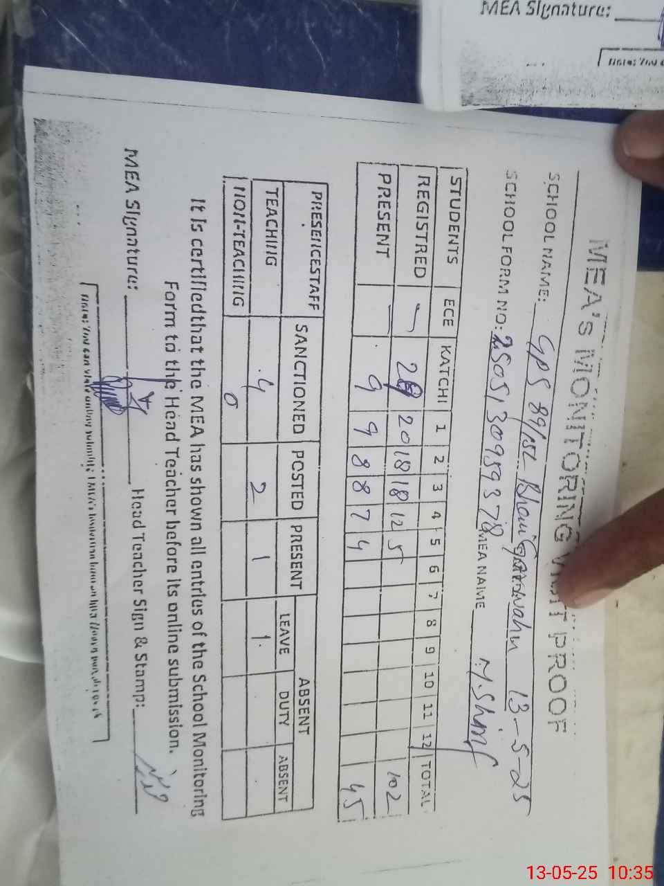| Attendance Register | Head Teacher | MEA with School | Visit Proof |