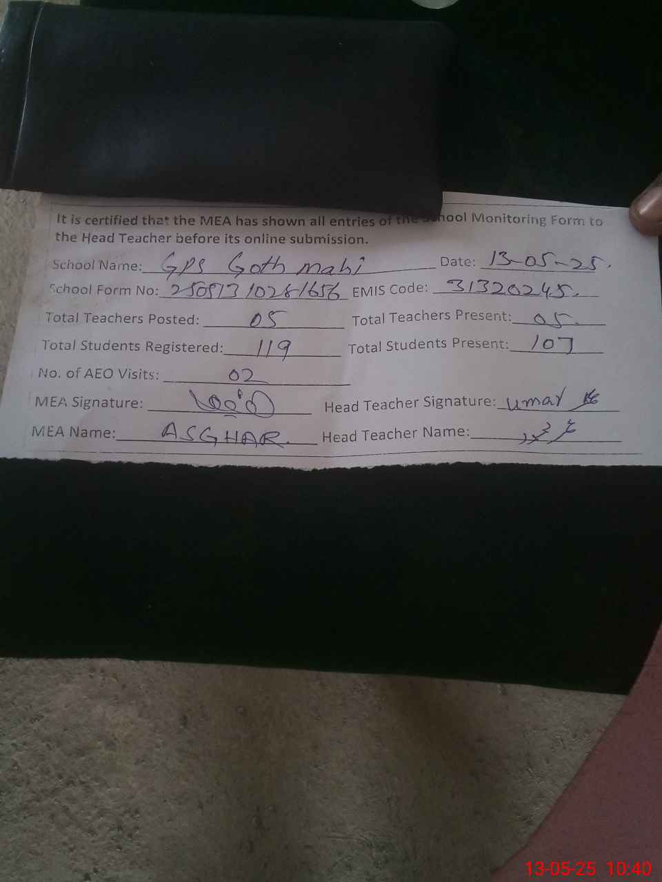 | Attendance Register | Head Teacher | MEA with School | Visit Proof |