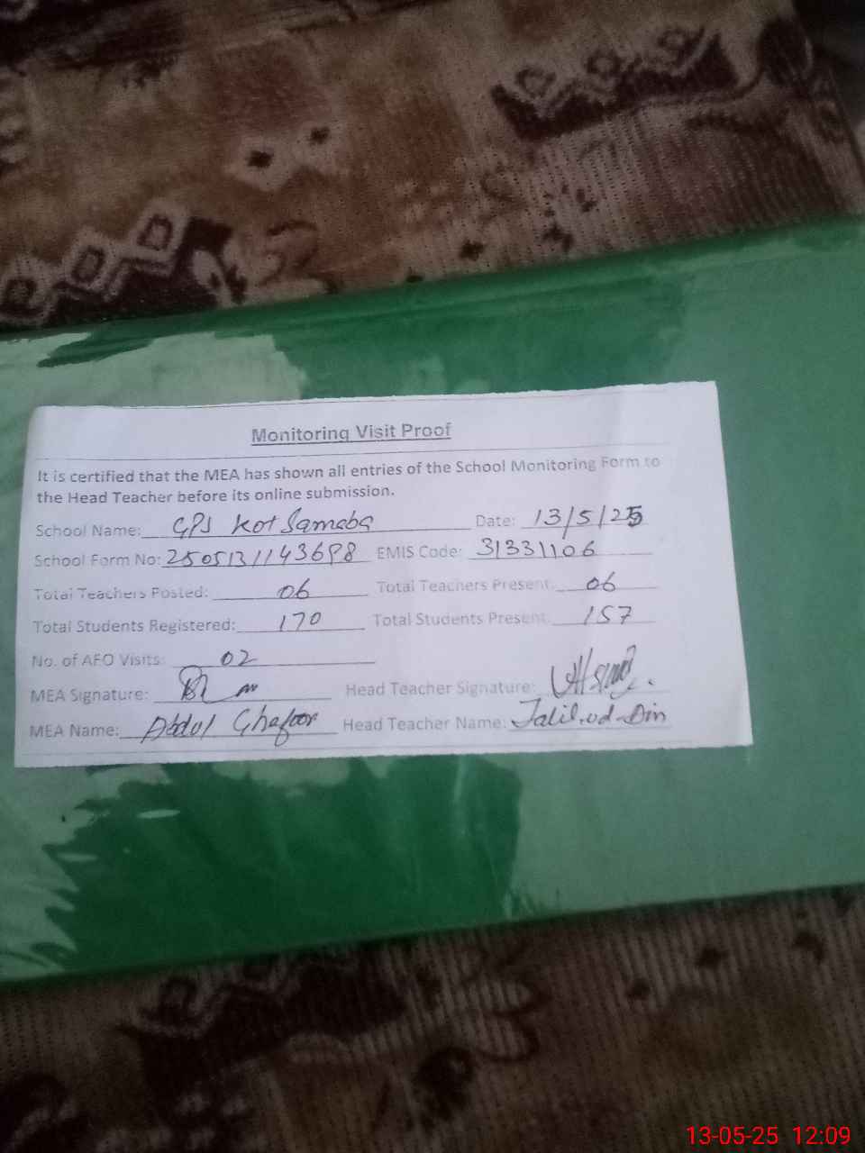 | Attendance Register | Head Teacher | MEA with School | Visit Proof |