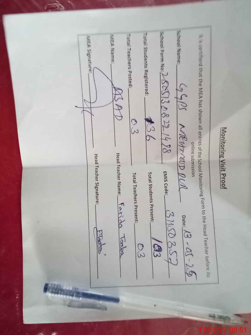 | Attendance Register | Head Teacher | MEA with School | Visit Proof |