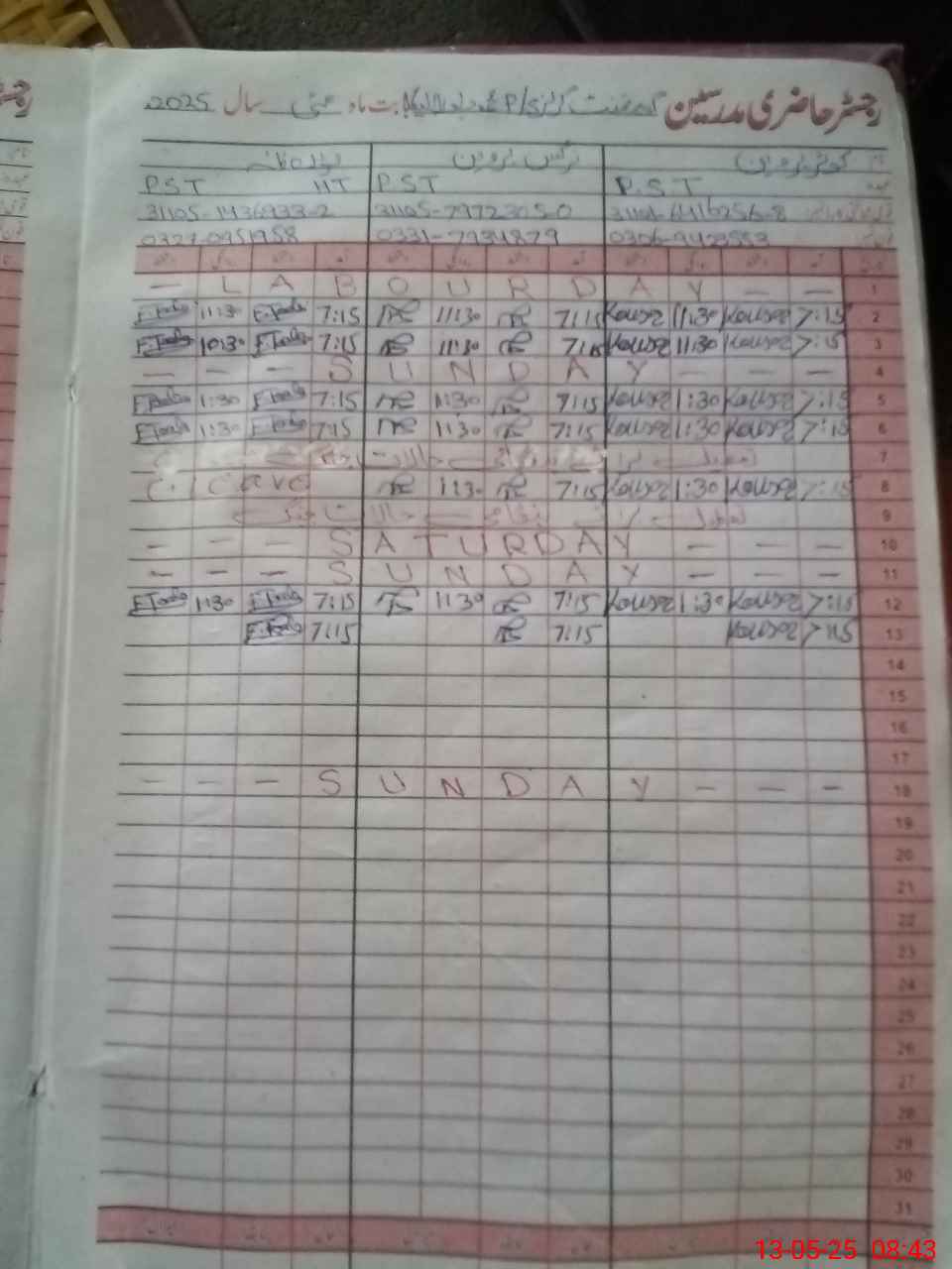 | CNIC | Full Name | Designation | R/C | Absence During Last Calender Month |