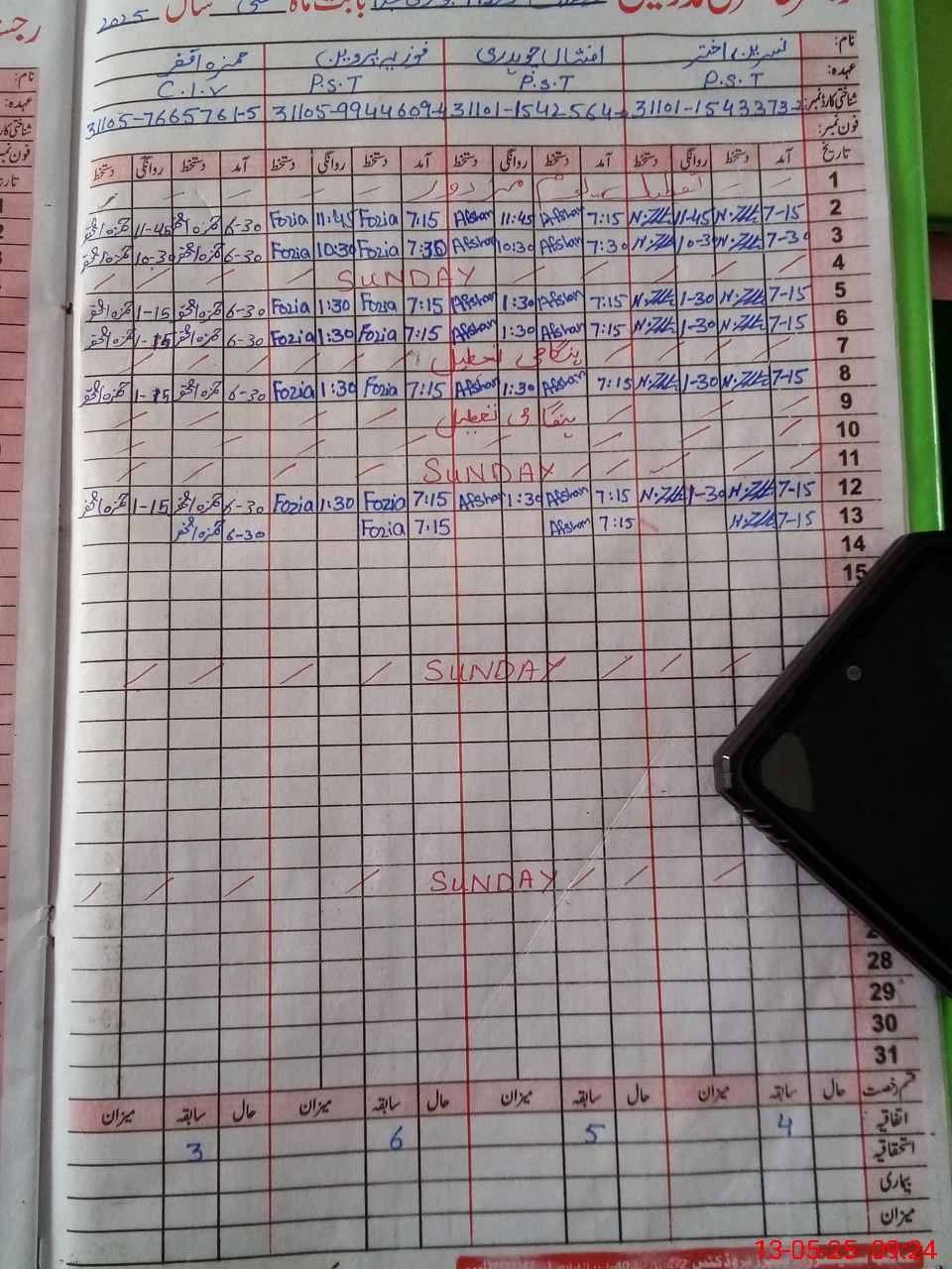 | CNIC | Full Name | Designation | R/C | Absence during last cal. month |