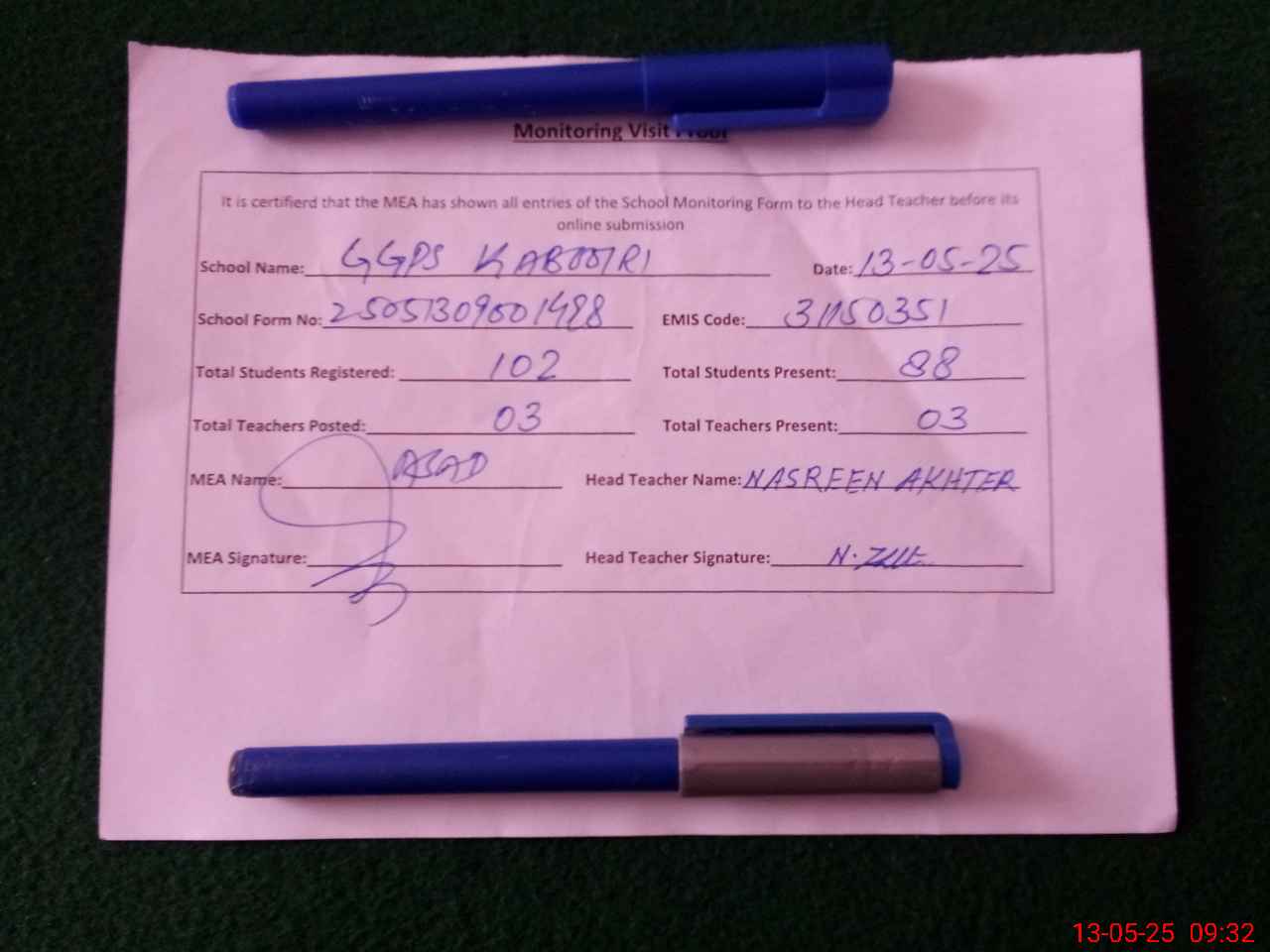 | Attendance Register | Head Teacher | MEA with School | Visit Proof |