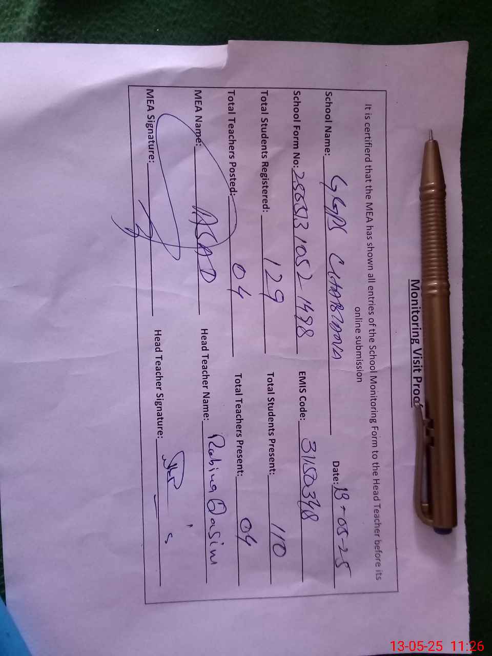 | Attendance Register | Head Teacher | MEA with School | Visit Proof |