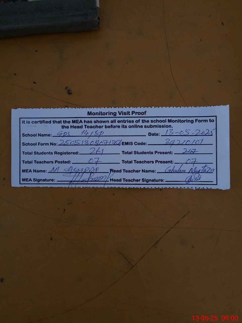 | Attendance Register | Head Teacher | MEA with School | Visit Proof |