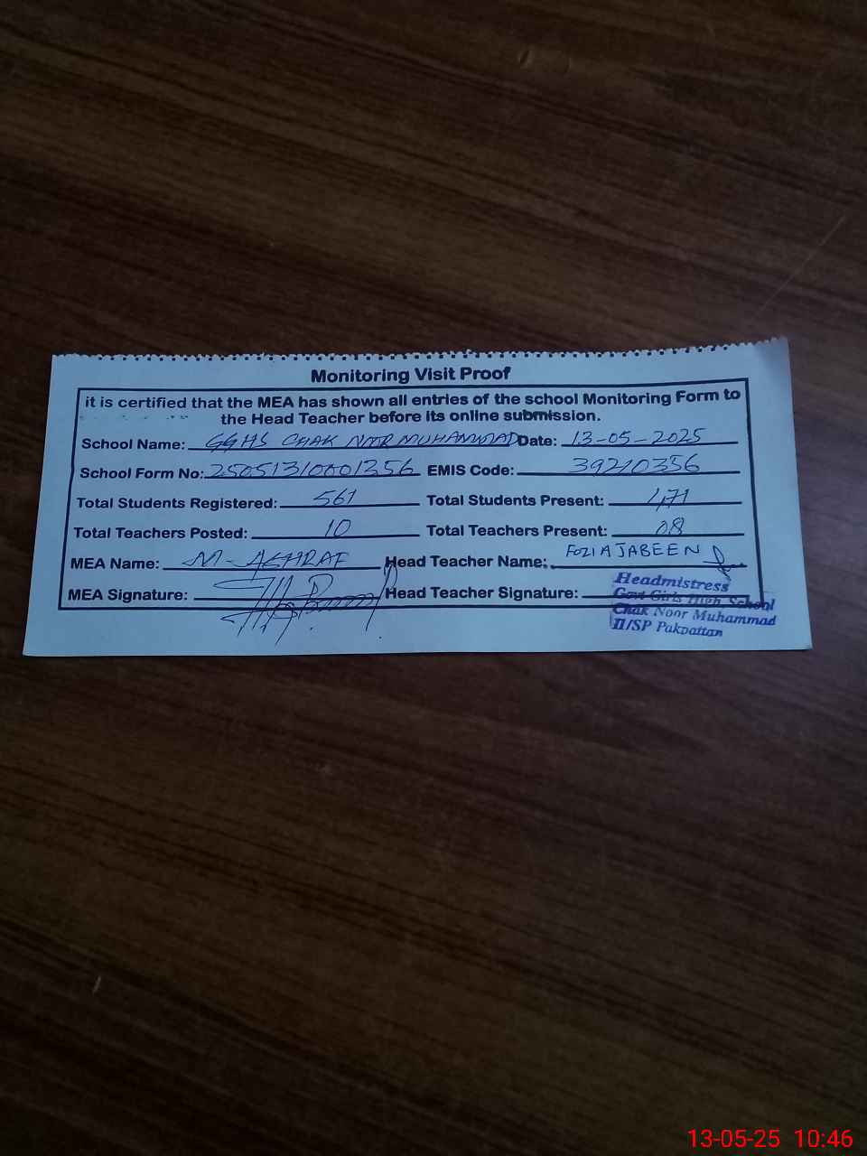 | EMIS Code: 39210356 | Name of School: GGHS CHAK NOOR MUHAMMAD 11/SP | |||