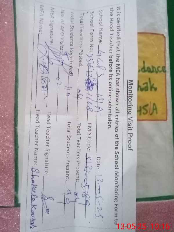 | Attendance Register | Head Teacher | MEA with School | Visit Proof |