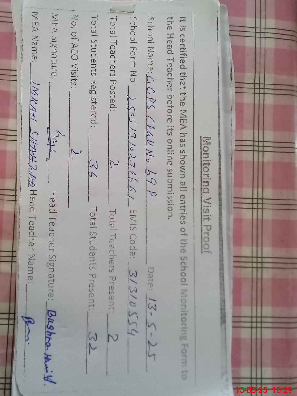 | Attendance Register | Head Teacher | MEA with School | Visit Proof |