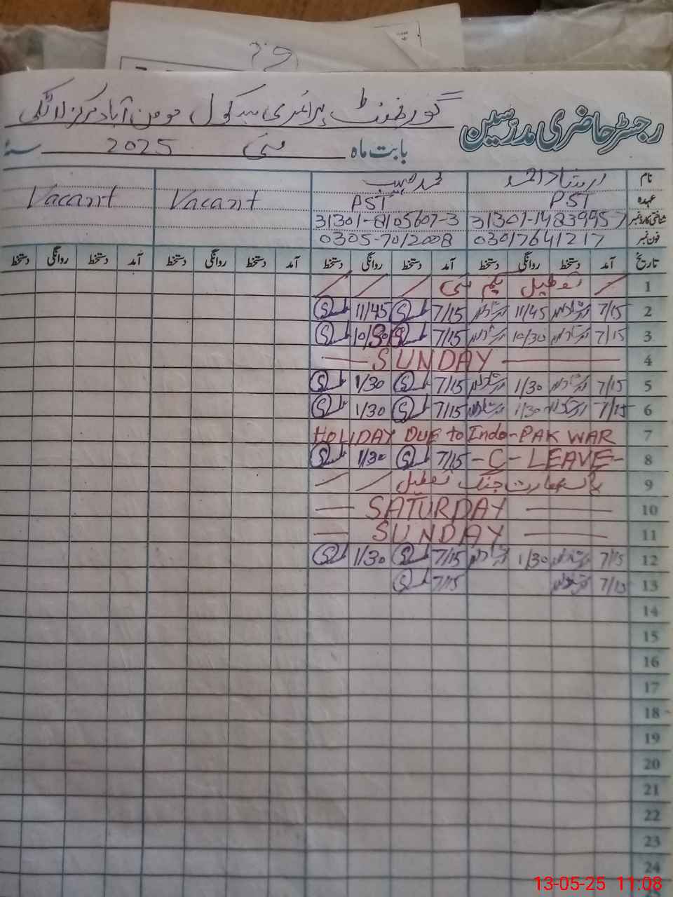 | Name: IR**** AH**** Designation: (School Headmaster's/Headmistress's) PST Phone/Cell Number: 03**** |