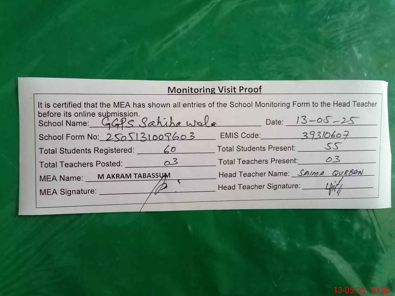 | Attendance Register | Head Teacher | MEA with School | Visit Proof |