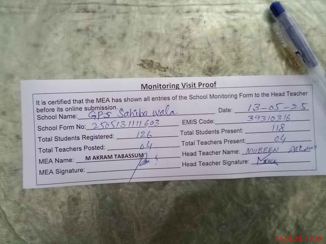| Attendance Register | Head Teacher | MEA with School | Visit Proof |