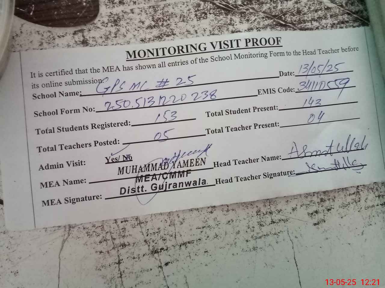| Attendance Register | Head Teacher | MEA with School | Visit Proof |