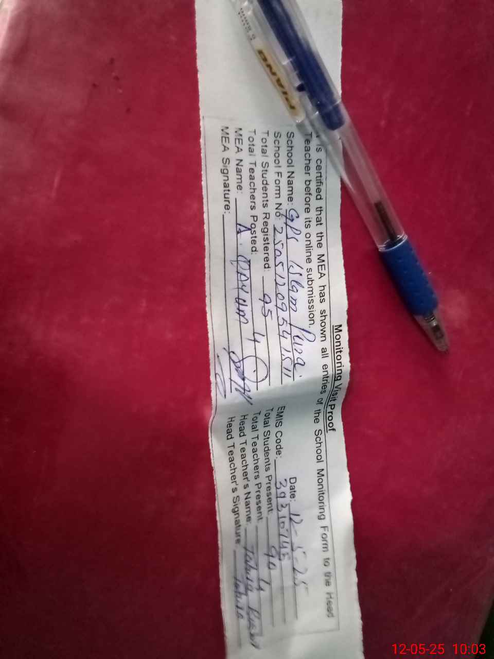 | Attendance Register | Head Teacher | MEA with School | Visit Proof |