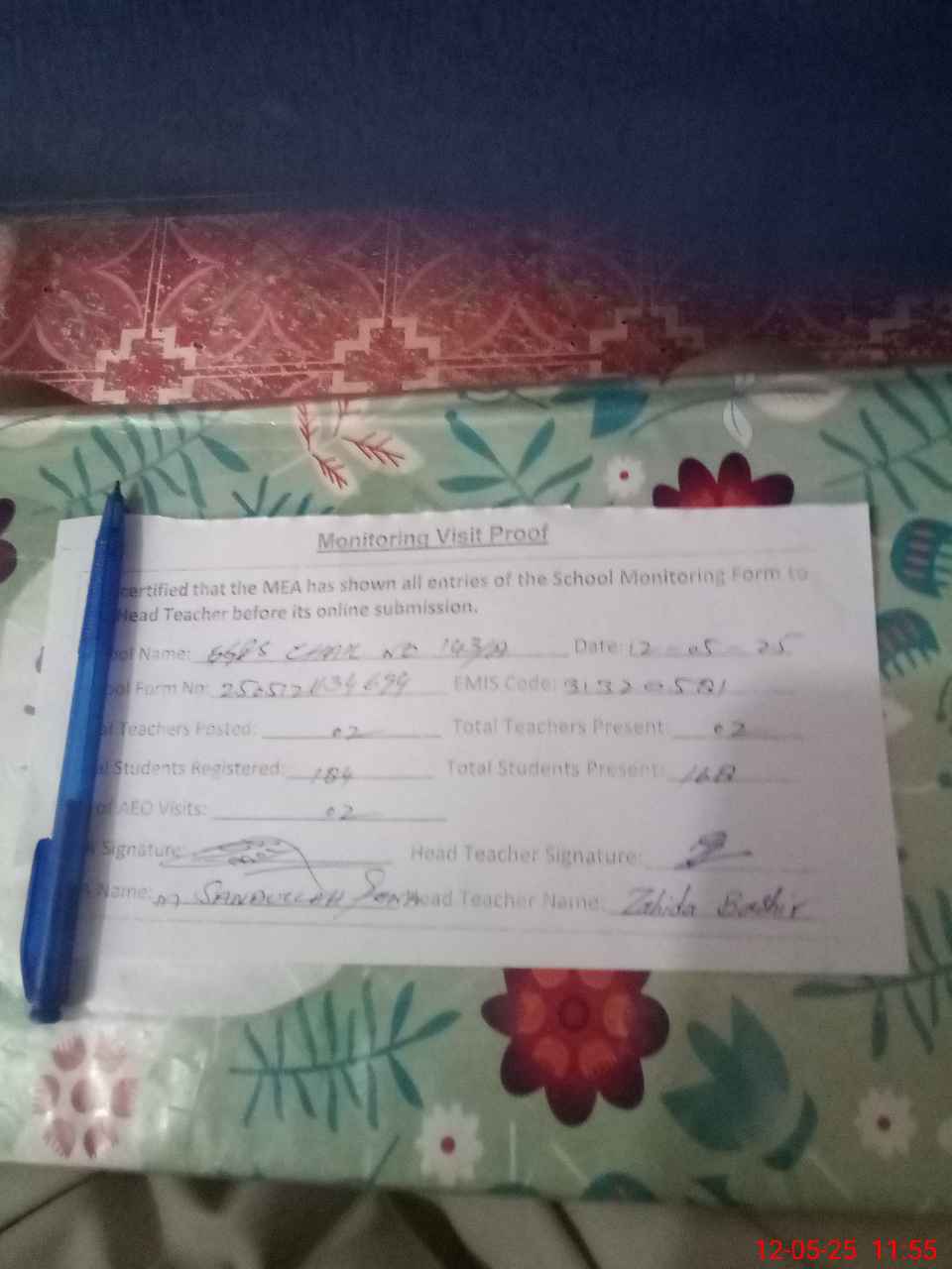 | Name: Za**** Ba**** Designation: (School Headmaster's/Headmistress's) PST Phone/Cell Number: 03**** |