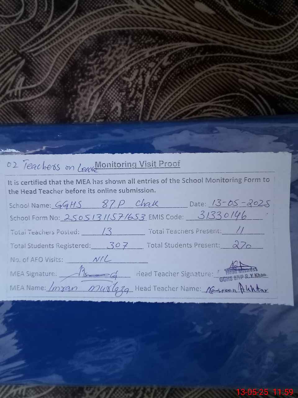 | EMIS Code: 31330146 | Name of School: GGHS CHAK NO. 87/P | |||