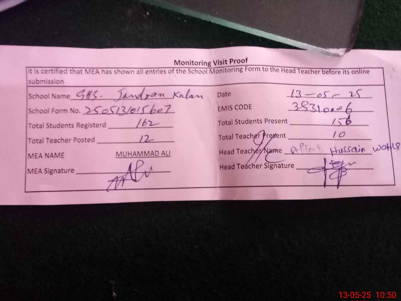 | Attendance Register | Head Teacher | MEA with School | Visit Proof |