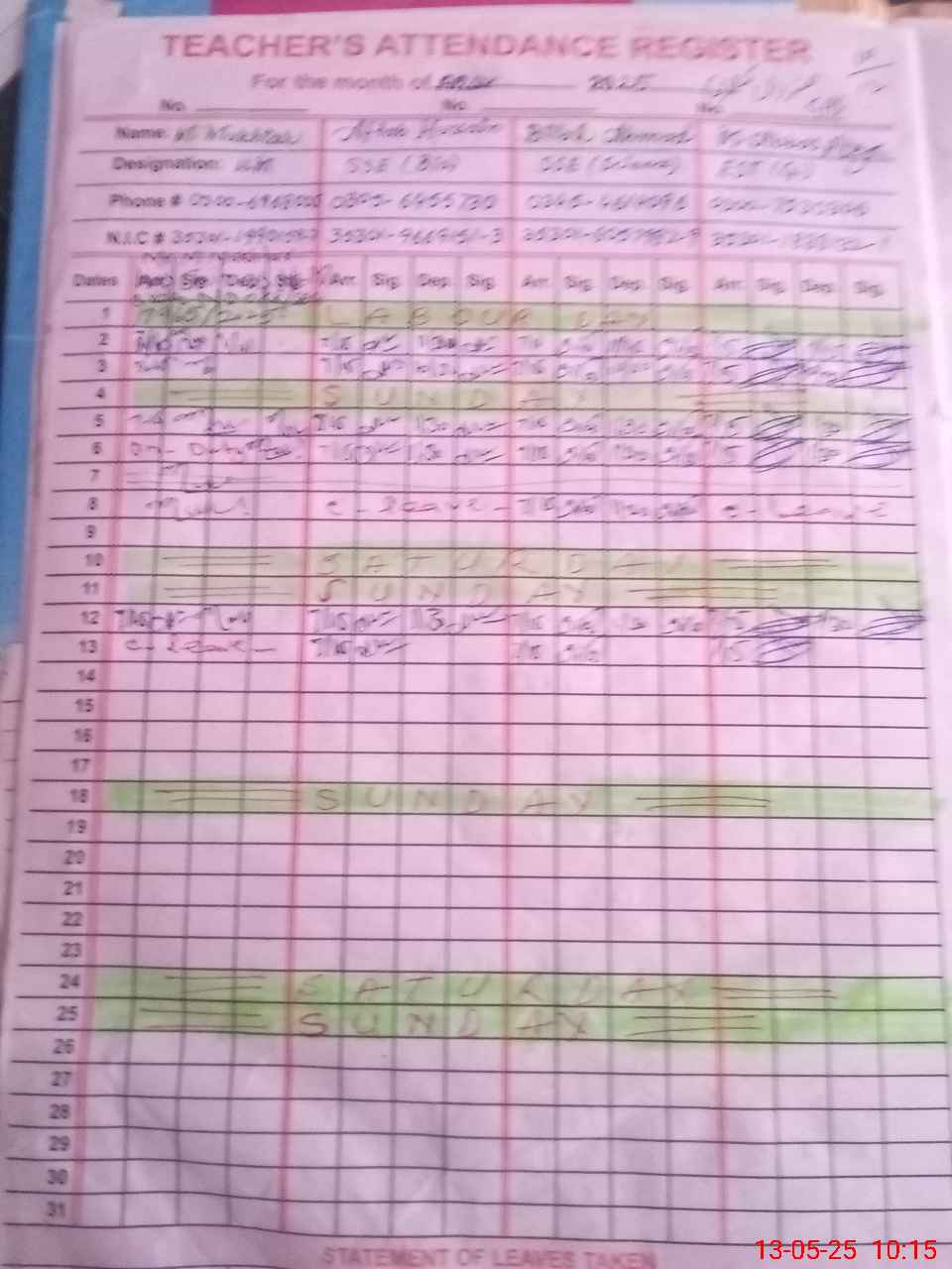 | CNIC | Full Name | Designation | R/C | Absence During Last Calender Month |