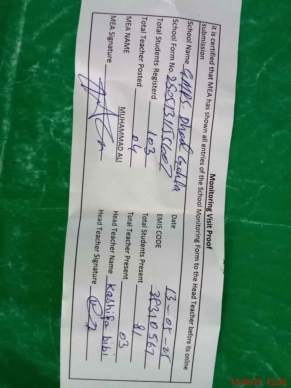 | Attendance Register | Head Teacher | MEA with School | Visit Proof |