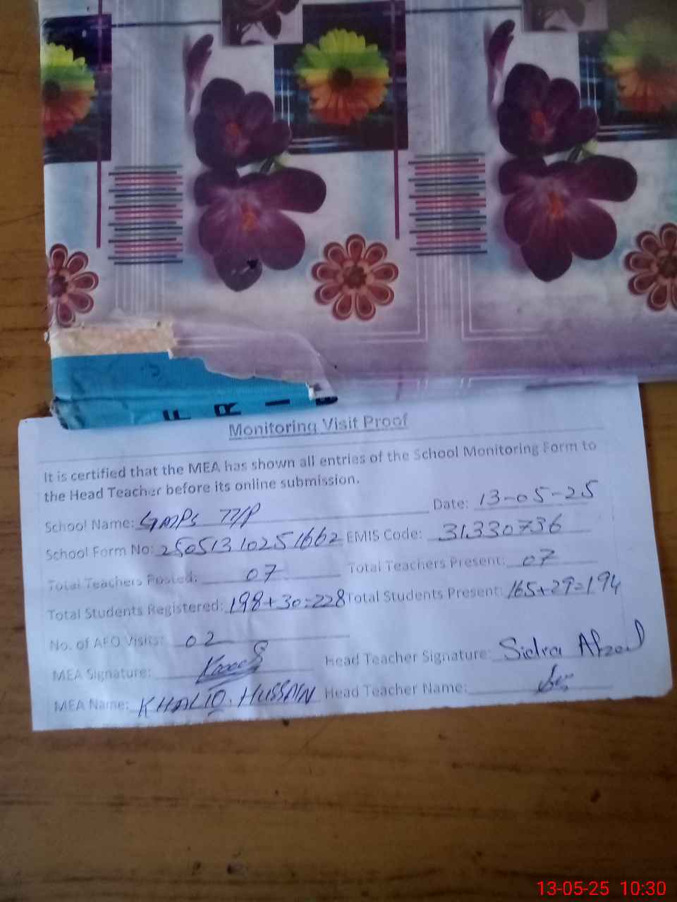 | Attendance Register | Head Teacher | MEA with School | Visit Proof |