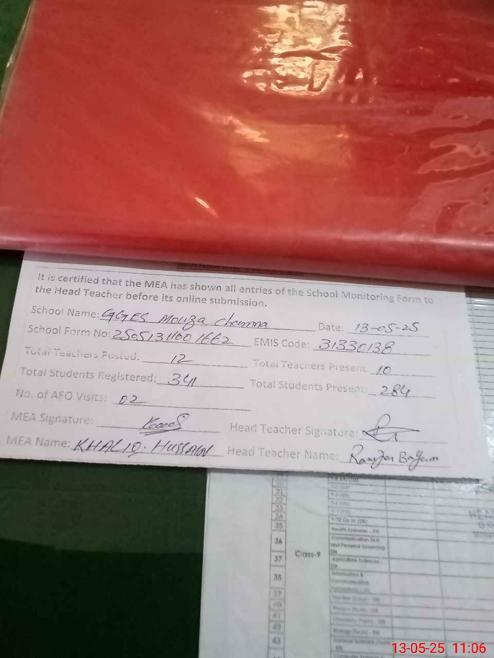 | Attendance Register | Head Teacher | MEA with School | Visit Proof |