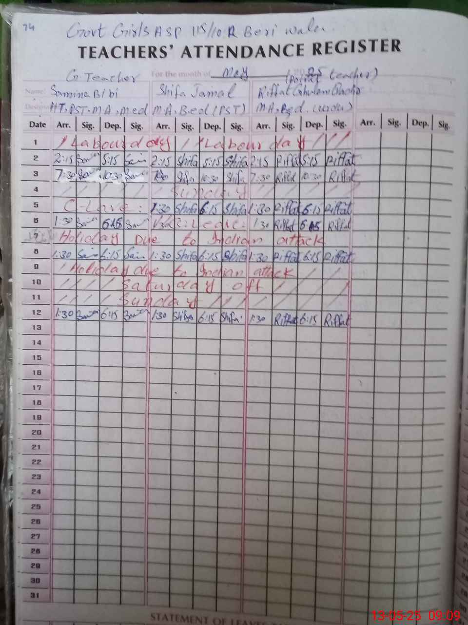 | CNIC | Full Name | Designation | R/C | Absence During Last Calender Month |