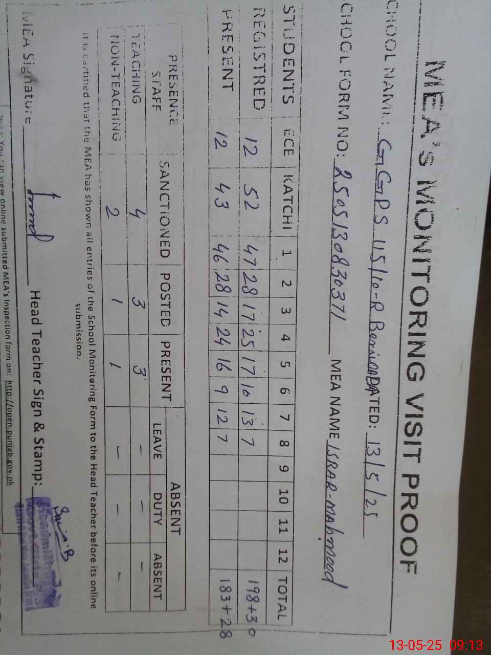 | Attendance Register | Head Teacher | MEA with School | Visit Proof |