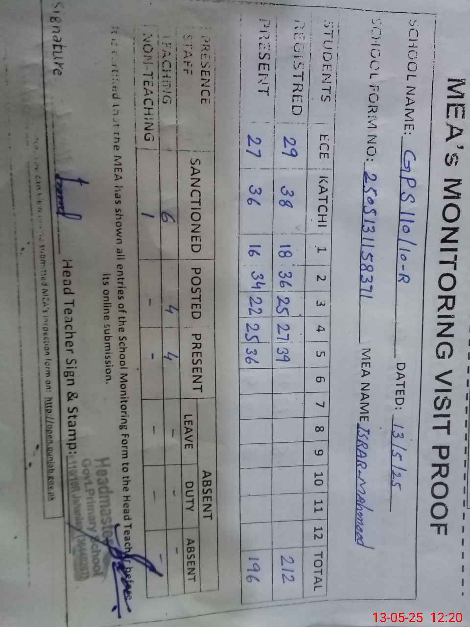 | Attendance Register | Head Teacher | MEA with School | Visit Proof |