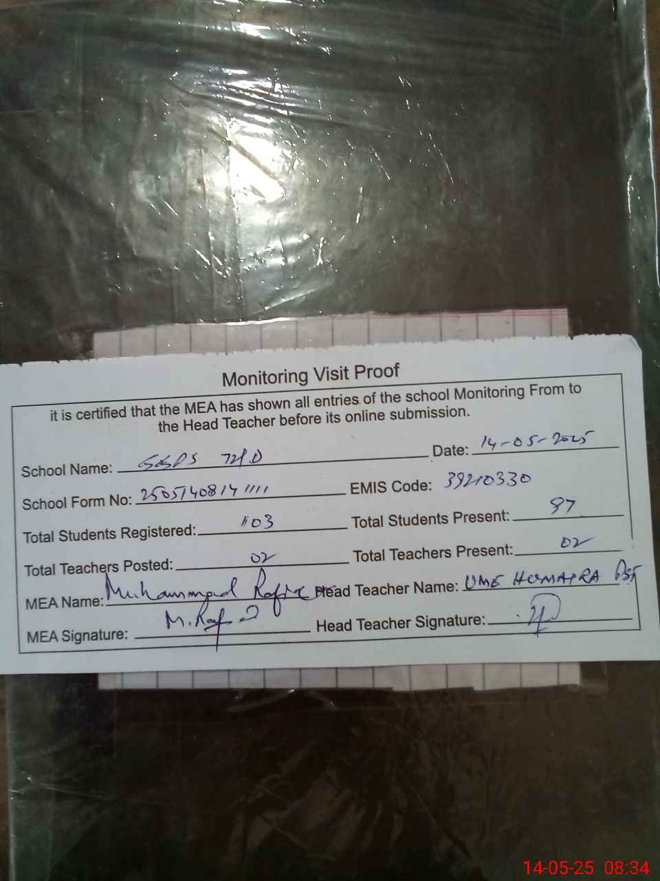 | Attendance Register | Head Teacher | MEA with School | Visit Proof |