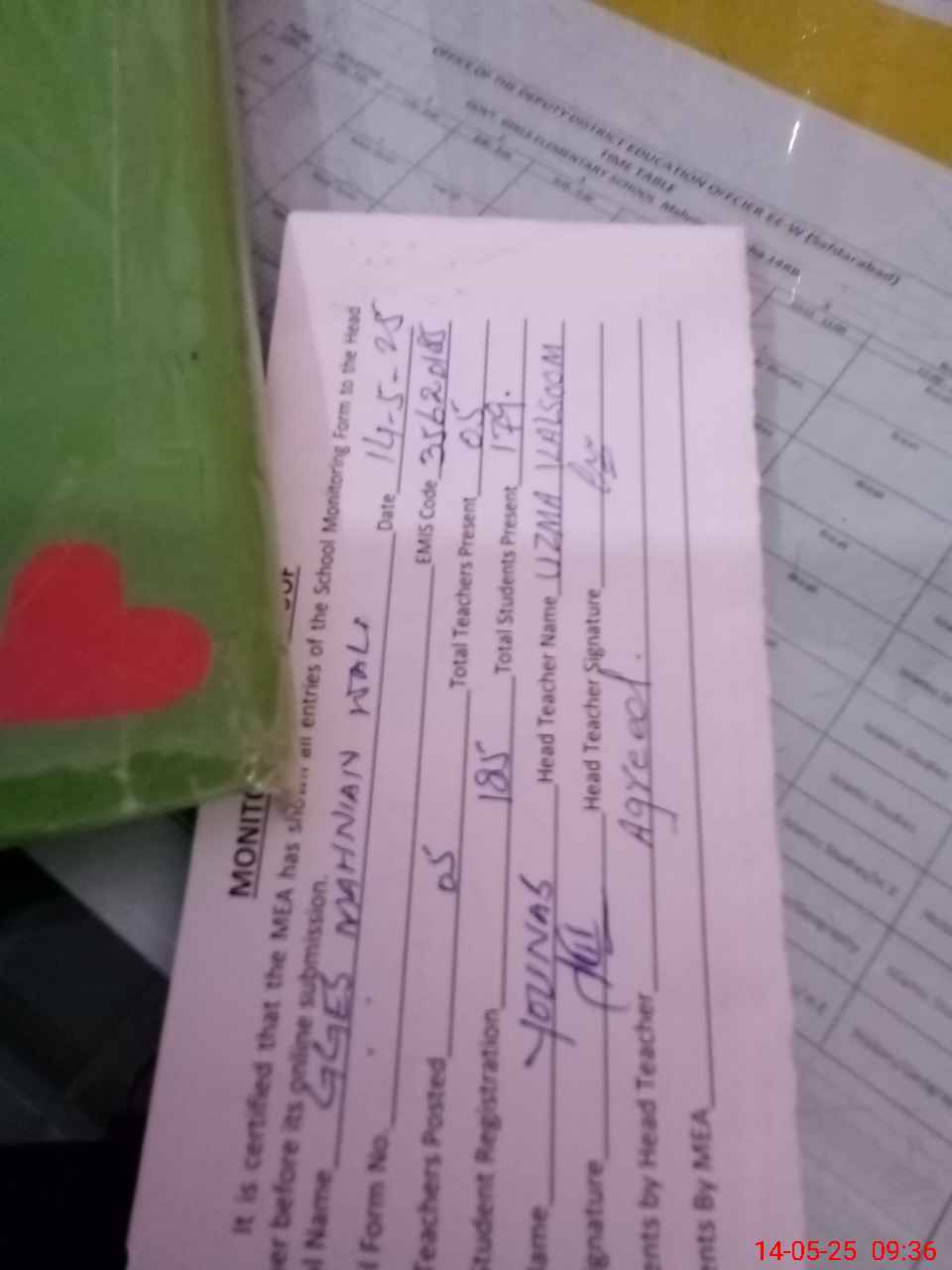 | Attendance Register | Head Teacher | MEA with School | Visit Proof |