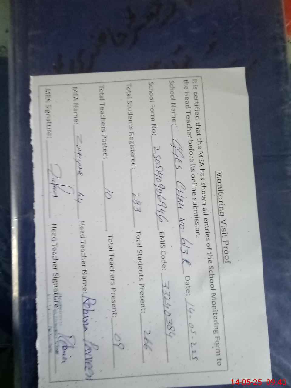 | Attendance Register | Head Teacher | MEA with School | Visit Proof |