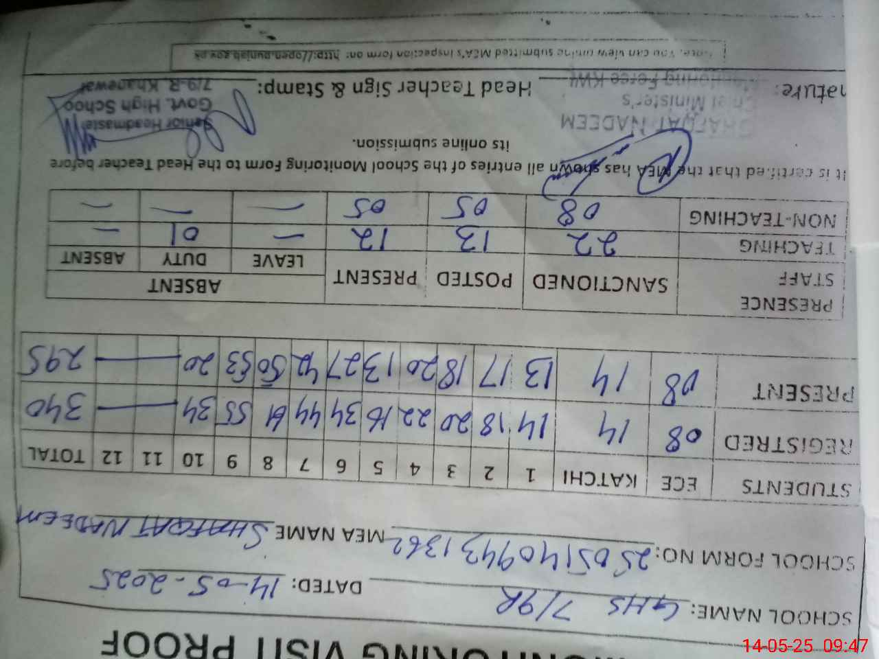 | Attendance Register | Head Teacher | MEA with School | Visit Proof |